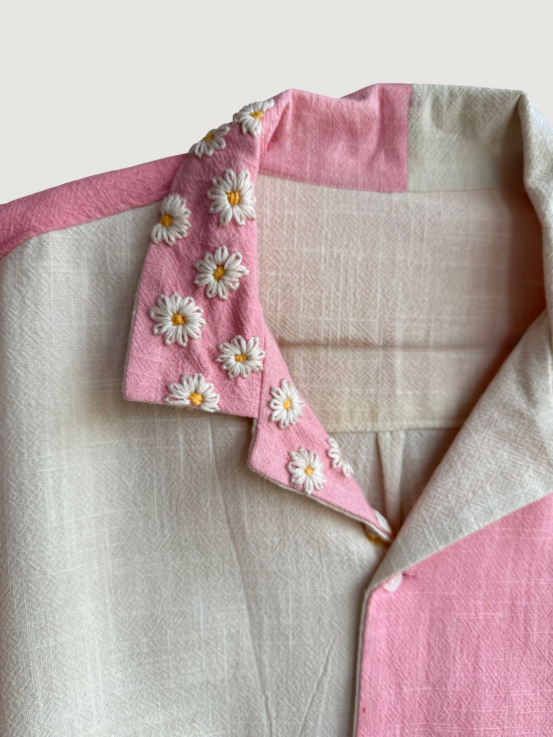 Gul blends blush pink and ivory with hand-embroidered daisies on the collar. A subtle tribute to the flowers lining Indian ghats. Light, breezy, and rooted in calm, it's made for moments that feel like poetry.